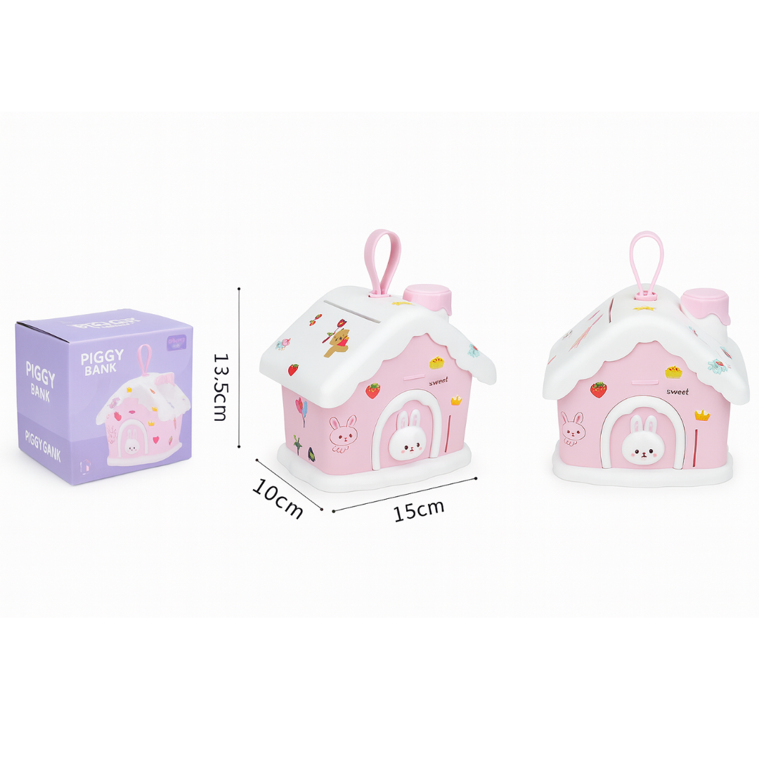 Fomenta el hábito del ahorro en los niños con esta adorable alcancía en forma de casa. Su diseño rosado con pegatinas 3D permite personalizarla y convertir el ahorro en una actividad divertida. Ideal como regalo de cumpleaños o decoración infantil.