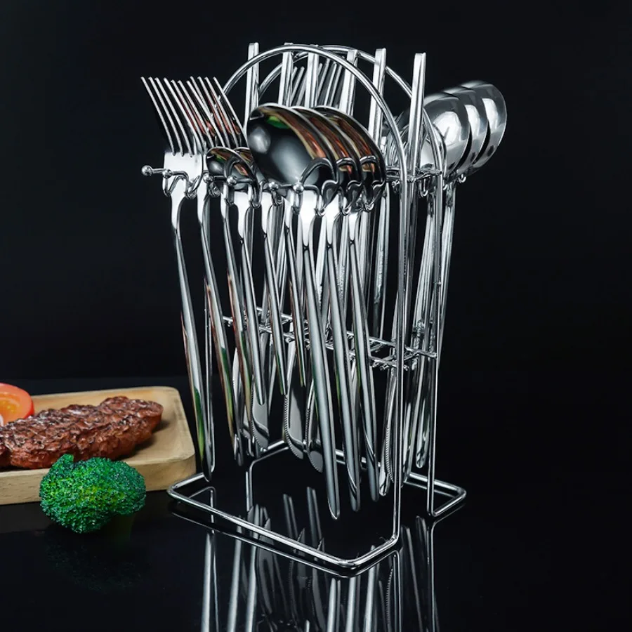 24 Piezas Completo: Incluye todo lo que necesitas para una cena completa: cuchillos, tenedores y cucharas, organizados en un estante de almacenamiento que mantiene tu vajilla ordenada y accesible.