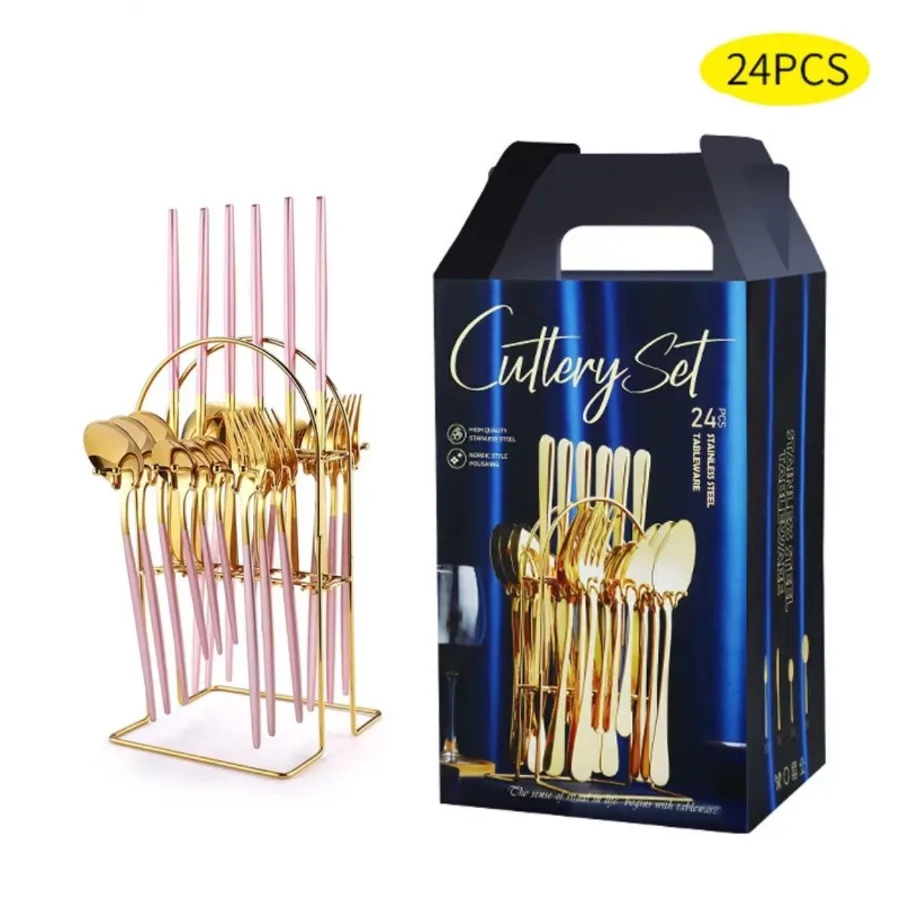 Juego de Vajilla de Acero Inoxidable con Estante de Almacenamiento - Caja de Regalo de Alta Gama (24 Piezas)