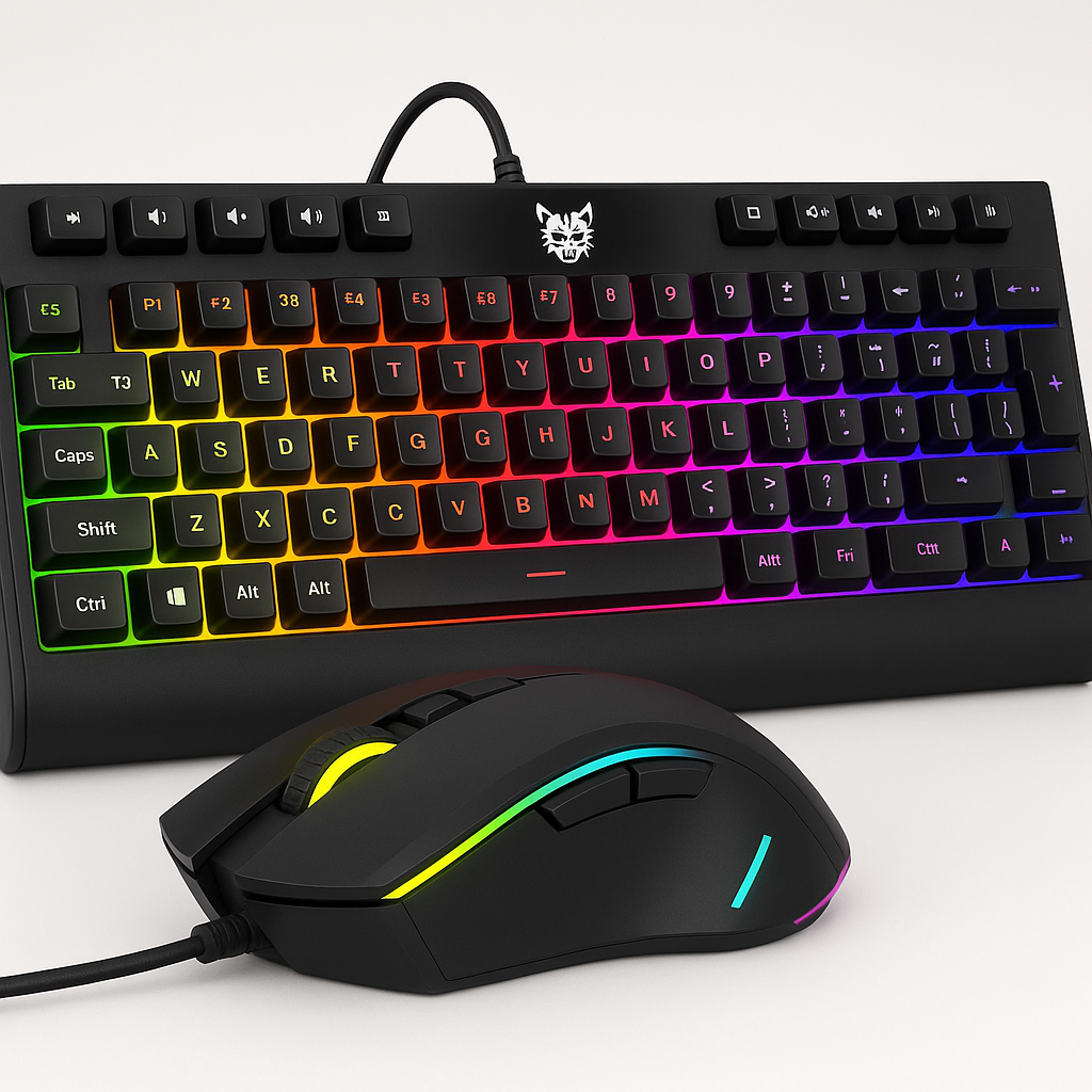 Este poderoso set incluye un teclado de tamaño completo con retroiluminación RGB y un mouse óptico profesional con sensor PixArt 3168 y hasta 6.400 DPI, diseñado especialmente para jugadores exigentes que buscan precisión, velocidad y estilo.