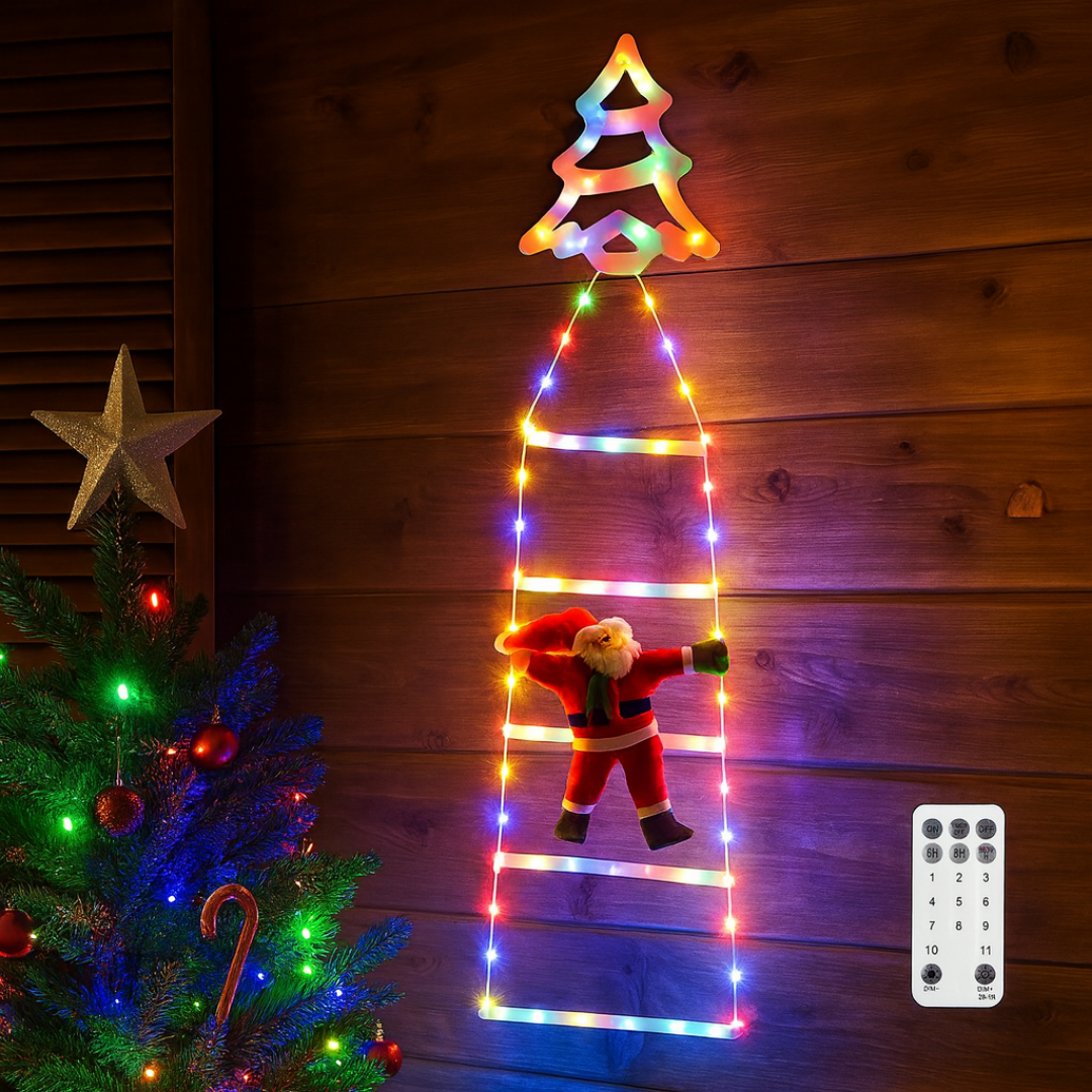 Diseño navideño original: Santa Claus escalando una escalera iluminada con luces LED multicolor.
